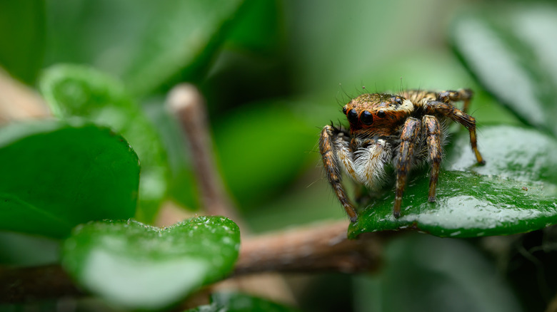 But the spider's principal eyes — the big, round eyes at the front and center of its carapace — are where the magic really happens. As we've seen, these eyes' two lenses help increase the amount of detail passing onto the spider's retinas, leading to them being able to see in sharp detail within a limited distance. Amazingly, the spiders can use their muscles to swivel these fluid-filled tunnels to remain focused on their prey. Once they've decided to attack, their rear-located side eyes allow them to ascertain their target's position and distance, letting them line up a precision leap to capture their lunch.