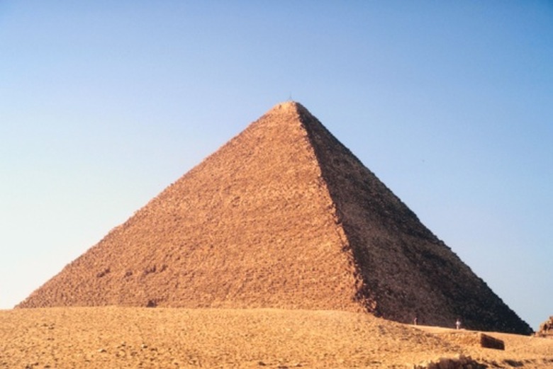 Used in many structures, temples and tombs around the world, the square pyramid has contributed to countless human constructions. Pyramids are polyhedrons (solid, three dimensional objects composed of flat faces and straight edges), and are formed when a base and its point, known as an apex, are connected by triangles. Geometry, a branch of mathematics that deals with shapes, sizes and space offers solutions to better understanding a pyramid's dimensions. Calculating the angles of a pyramid refers to the angle between two adjacent triangular faces on a pyramid.