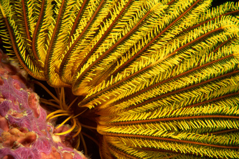 Feather star represents one of 550 living species of crinoids. Its derives its name from the feathery fringes found on its arms. These arms allow the feather star to swim. Another modern day crinoid is the sea lily, which resembles a plant. They differ from feather stars in that they are attached to the ocean floor. They sway back and forth with the currents as plants would. Their stalks are made of stems with disks like their extinct ancestors. Crinoids may resemble plants, but they are animals belonging to the same family as starfish, sea urchins and sea cucumbers — the echinoderms. This family is known for its rough surface and radial symmetry based on five or multiples of five.