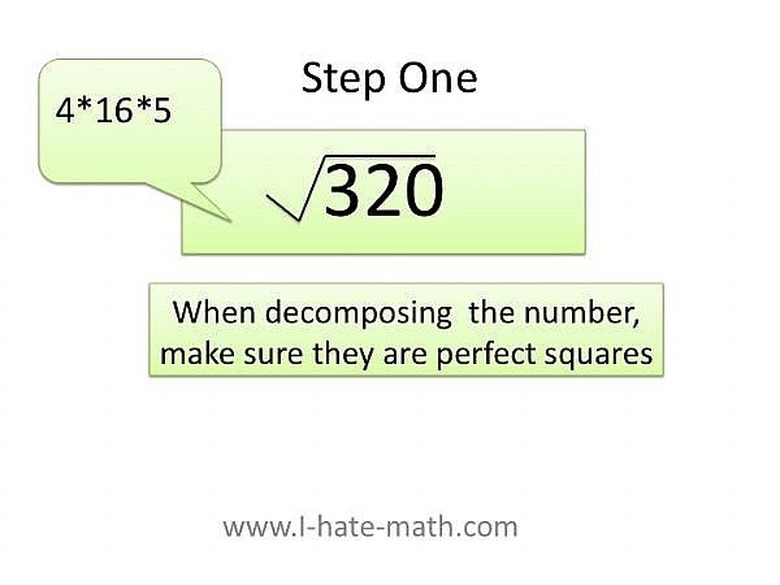 How do I find the square root of a number? Let's say we need to find the square root of 320. Well, your main goal is to find the factors of 320, that means the numbers that composed 320, then organize them by perfect squares (ie 16,25,36,81,100, etc) For example: 320= 2_2_2_2_2_2_5, now organize them by perfect squares (the ones you can not make a perfect square just leave it alone) 320= 4_4_4_5 or 320=16_4*5