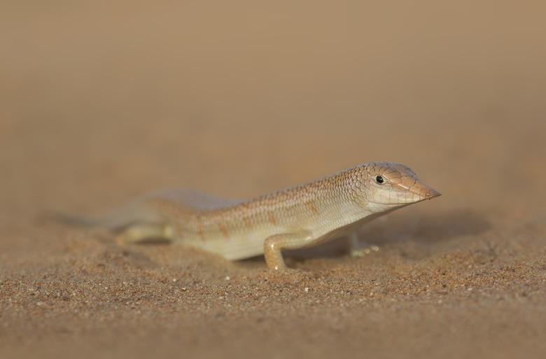 This lizard has four legs, but they are small and virtually nonfunctional. As adults, sand skinks grow up to approximately 5 inches. These reptiles' natural habitat are sandy areas, as their name suggests, and coniferous forests with pine trees. A sand skink's reproduction period typically occurs in the spring.